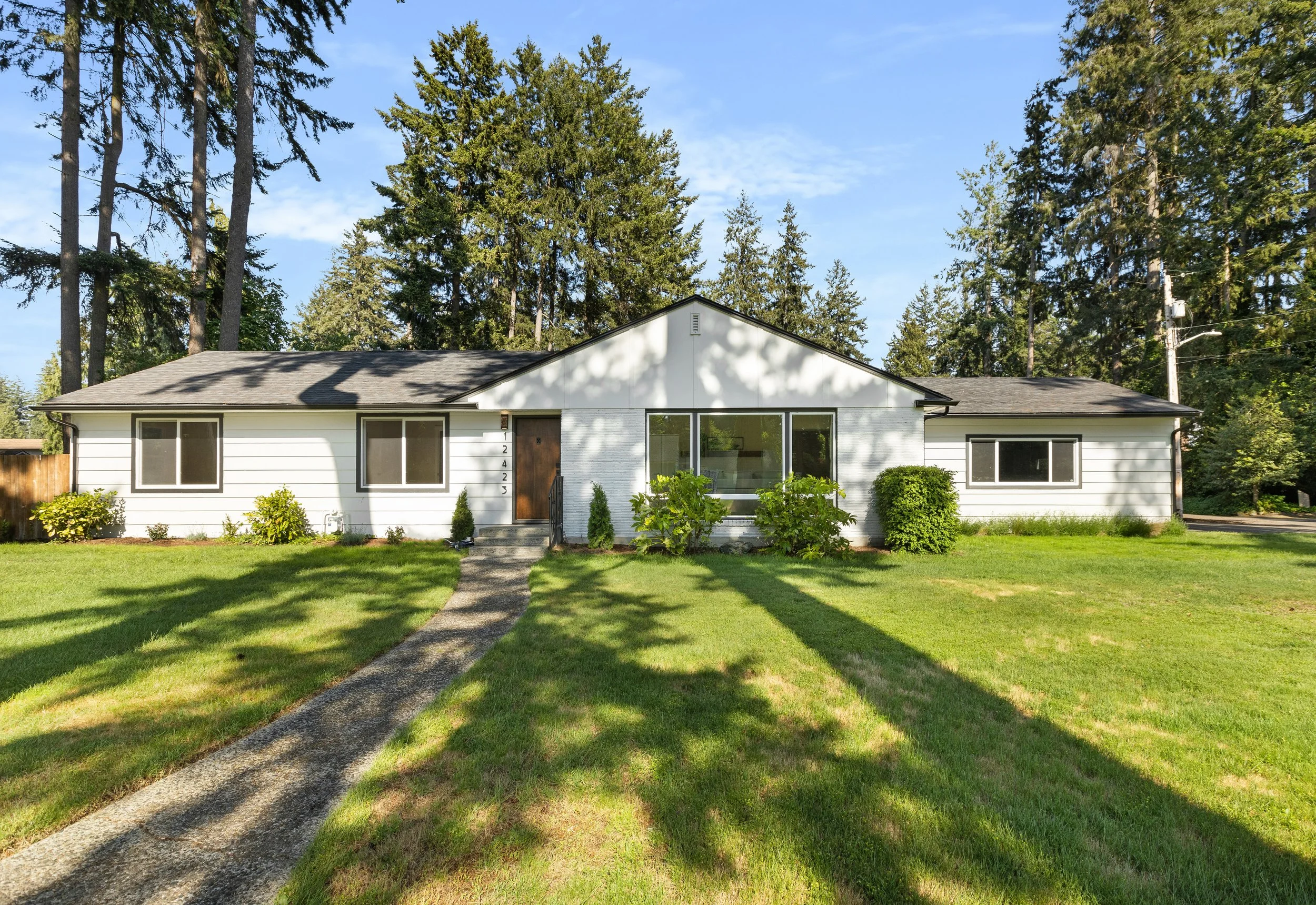 Bright sun filtered between towering trees gives the impression of a happy dreamscape. The greenery and sunshine perfectly contrast the home’s clean lines and crisp, white paint as a rich wood door anchors the home and shares a touch of its past.